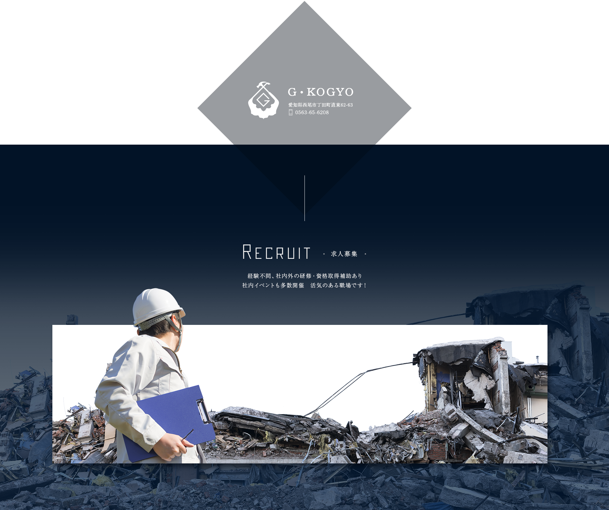 G・KOGYOは愛知県西尾市に拠点を置き、愛知県内、三重、東京、神奈川エリアにて解体工事をメインに活動しております。